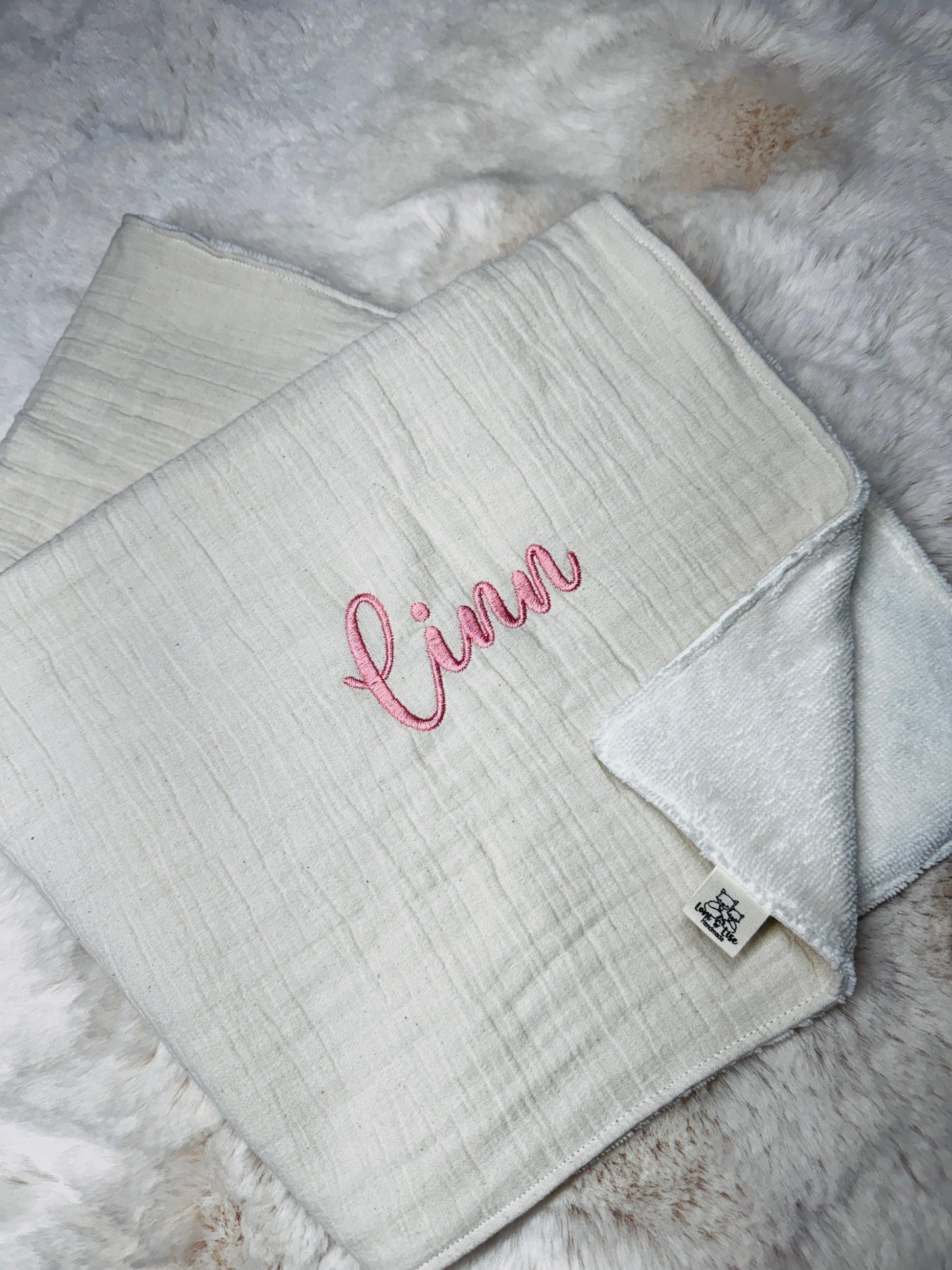 Personalisiere sie mit dem Wunschnamen und genieße die hochwertige Bestickung. Wähle die Farbe des Musselins und der Bestickung (Gestaltungswunsch) selbst aus! Das schlichte und edle Design, die Oberseite aus 100% Baumwollmusselin und die Unterseite aus 100% Bambusfrottee machen sie perfekt zum Schmusen oder für den Kinderwagen. Ein perfektes Geschenk zur Geburt und ein süßes Erinnerungsstück.