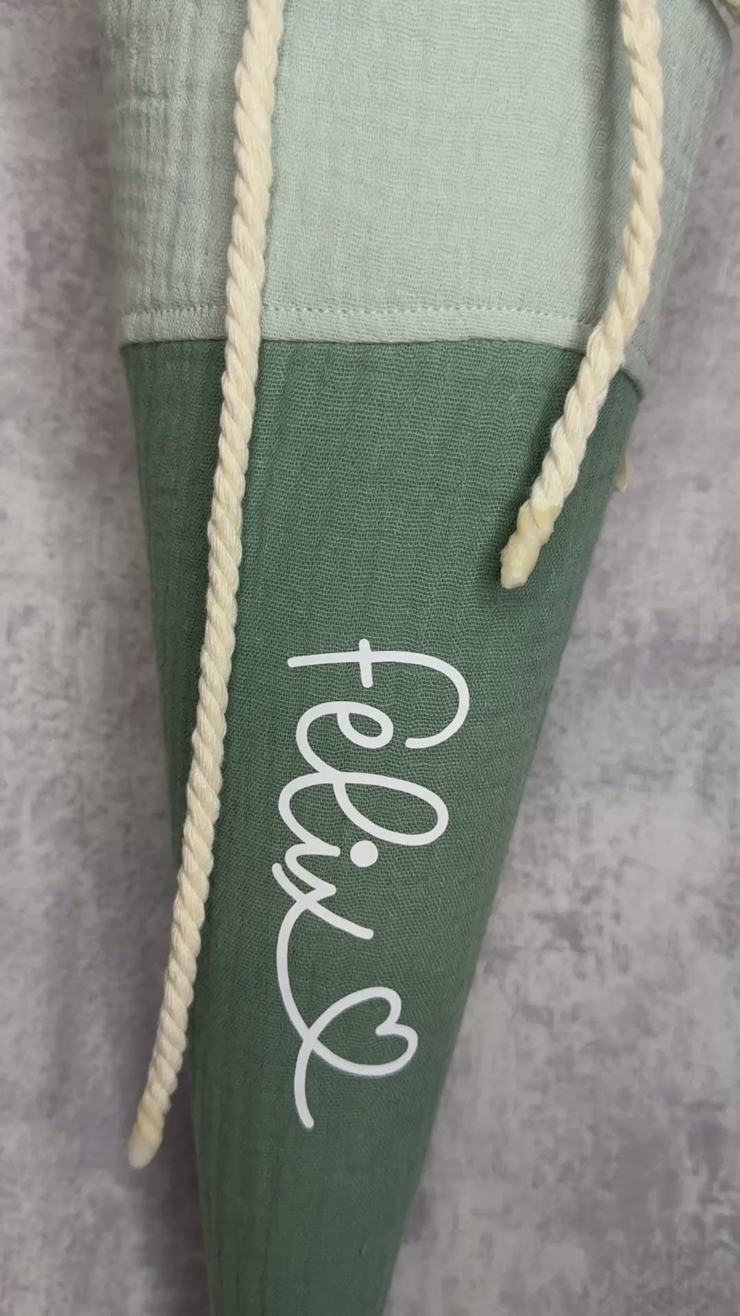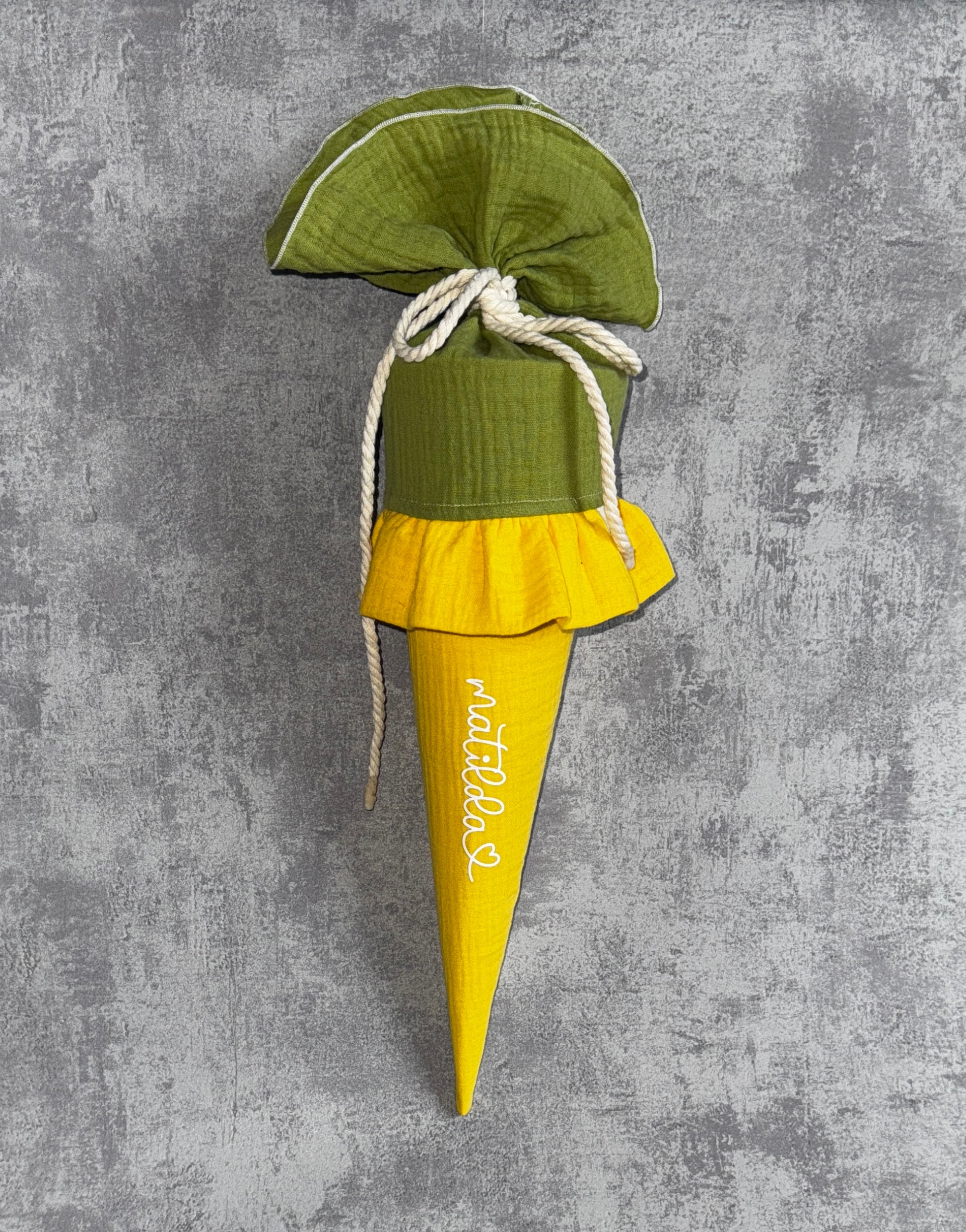 Diese 35 cm großen Schultüten sind ideal für Kindergartenkinder zum ersten Tag in der KiTa oder als liebevolles Geschenk für Geschwisterkinder zur Einschulung. Das schlichte und edle Design lässt sich mit dem Namen des Kindes personalisieren – so wird jeder Start besonders und unvergesslich! Im Bereich "Gestaltungswunsch" kannst du zudem angeben, ob eine zusätzliche Aufschrift "Kindergartenkind & Jahr" gewünscht ist oder zusätzliche Farbwünsche/ Motivwünsche für den Stoff eintragen.