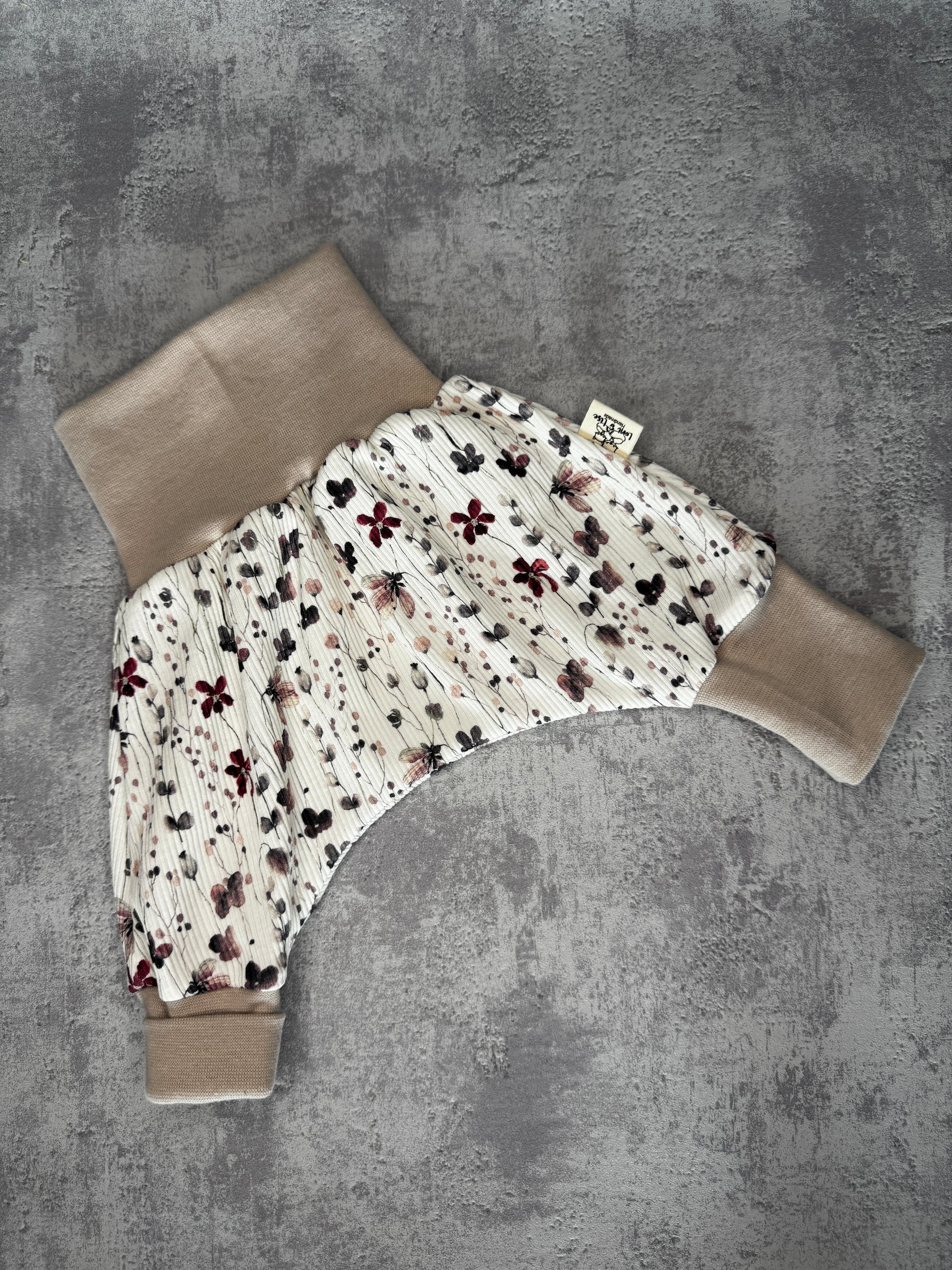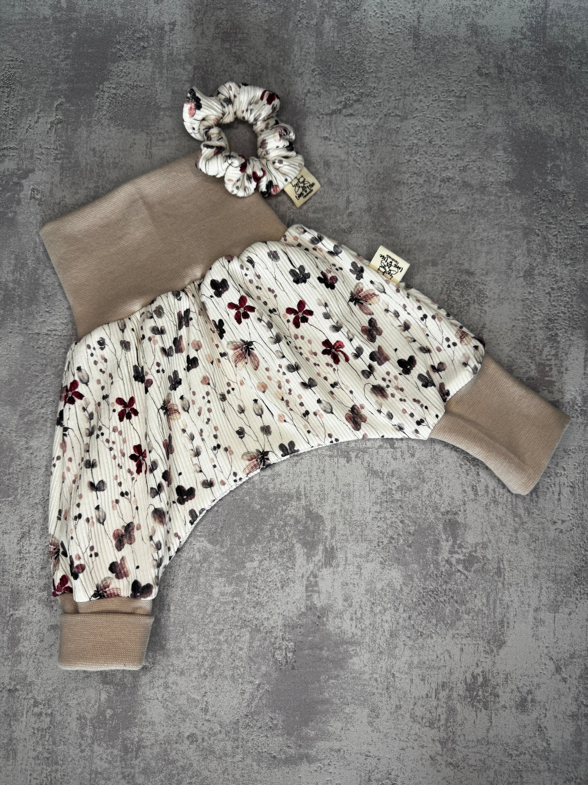 Diese handgefertigte Pumphose aus weichem Rippjersey (95% Baumwolle und 5% Elasthan) begeistert mit einem zarten floralen Design. Die mitwachsenden Bündchen an Bauch und Beinen sorgen für bequemen Sitz, während die seitlichen Nähte ideal für Babys sind, die viel liegen. In Größe 44-50 passt sie perfekt für Frühchen und kleine Babys. Passend dazu gibt es ein Scrunchie für Kinder zum Vorteilspreis – so wird das Outfit zum süßen Hingucker!