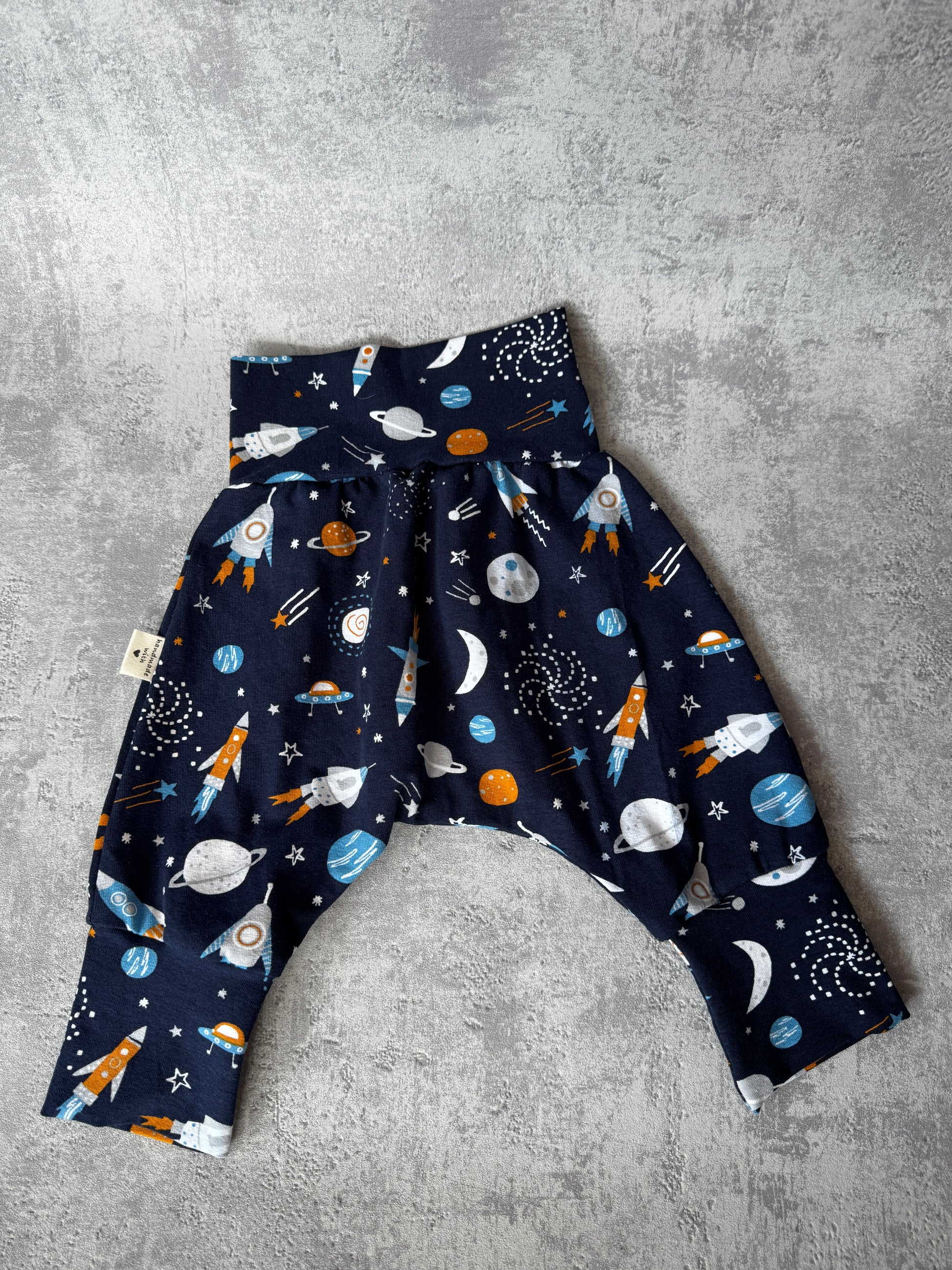 Diese handgefertigte Pumphose in Größe 62 begeistert mit einem verspielten Weltraum-Design. Das breite Bauchbündchen sorgt für angenehmen Halt und Komfort, während die Mitwachsbündchen an den Beinen mitwachsen und lange Freude bereiten. Perfekt für kleine Entdecker, die stilvoll und bequem durch den Alltag schweben wollen! Diese süße Pumphose ist aus einem weichen Baumwolljersey (95% Baumwolle und 5% Elasthan).